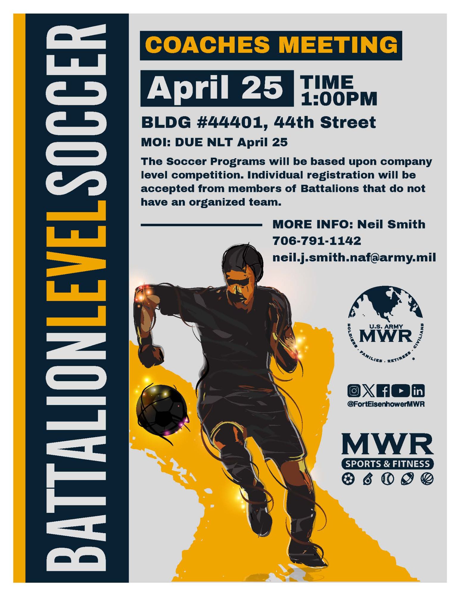The Battalion Level Soccer Program is based upon company level competition. Individual registration will be accepted from members of Battalions that do not have an organized team. The Sports Office will make assignments.