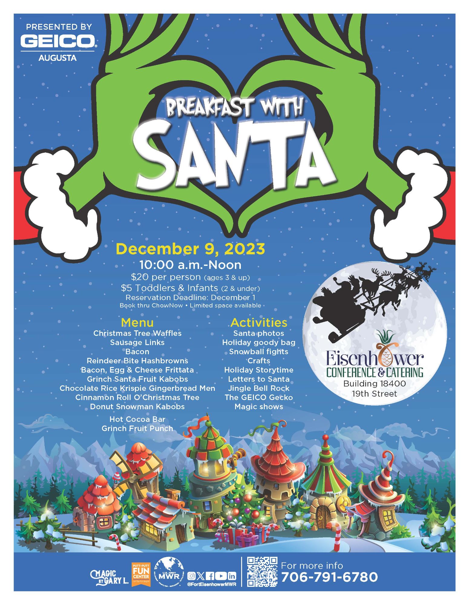 Santa is making a special trip to Fort Eisenhower to have breakfast. Join Santa and his special elf, the GEICO gecko, for breakfast at Eisenhower Conference & Catering. Join Santa for indoor snowball fights, children's crafts, holiday storytelling, magic shows, a mailbox to send lists back to the North Pole, and much more!