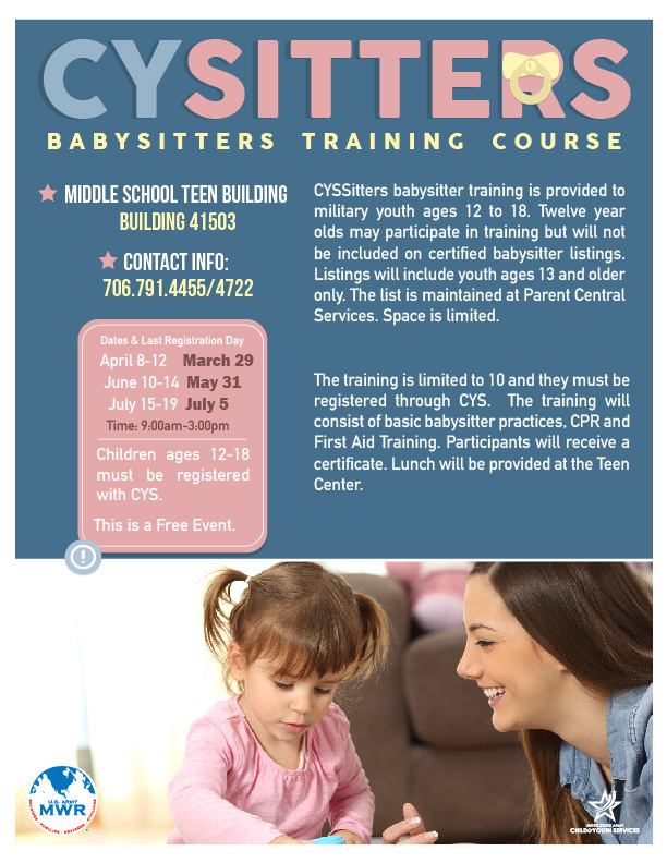 CYSitters training is provided to those 12 years and older. Space is limited, so hurry and register! The training is limited to 10 spots per session and they must be registered through CYS. The training will consist of basic babysitter practices, CPR and First Aid Training. Participants will receive a certificate, and lunch will be provided at the teen center. A list of the trained/certified babysitters will be available at Parent Central Services per request.