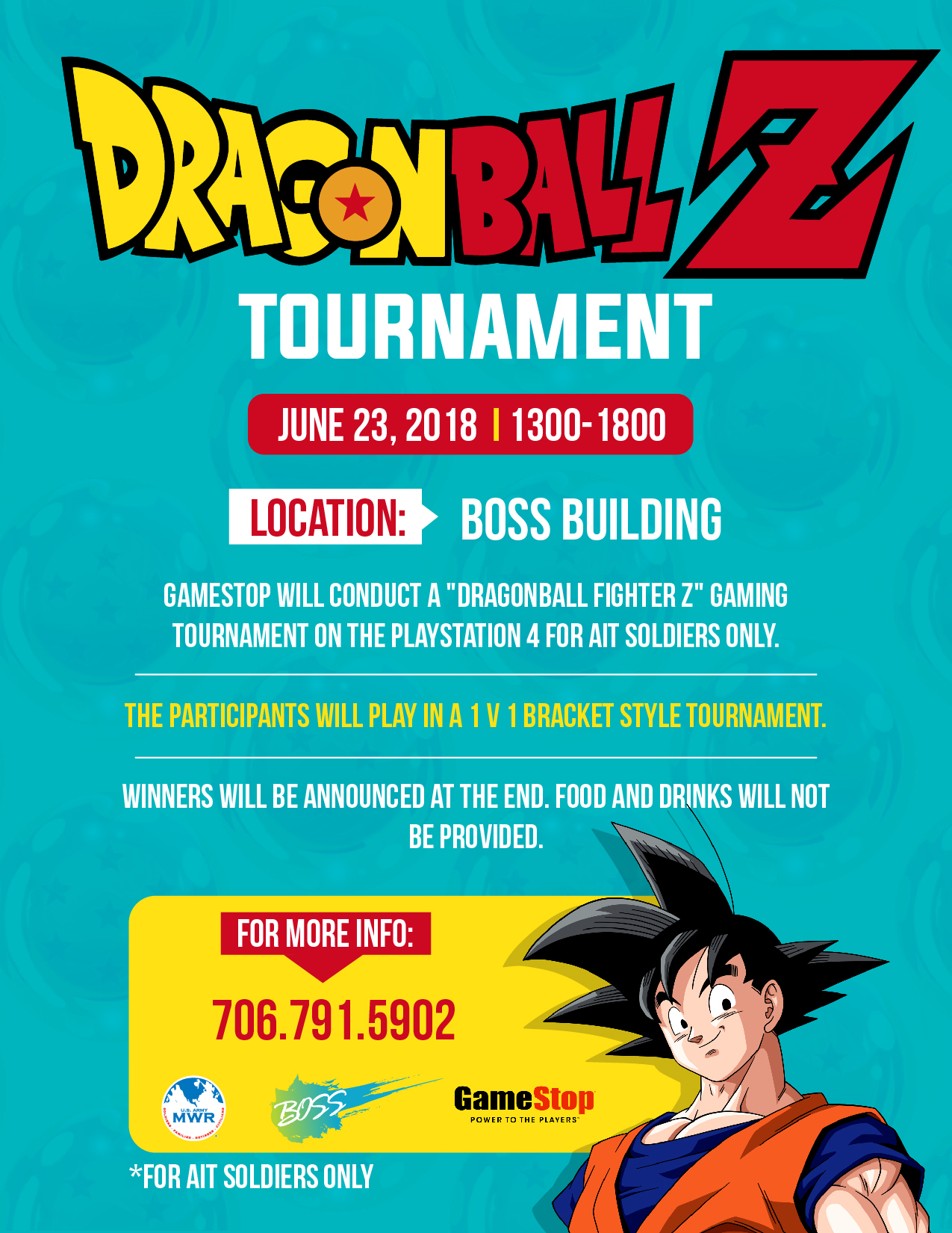 Gamestop is having a "Dragonball Fighter Z" gaming tournament for AIT soldiers only. The participants will play in a one on one bracket style tournament. Winners will be announced at the end.