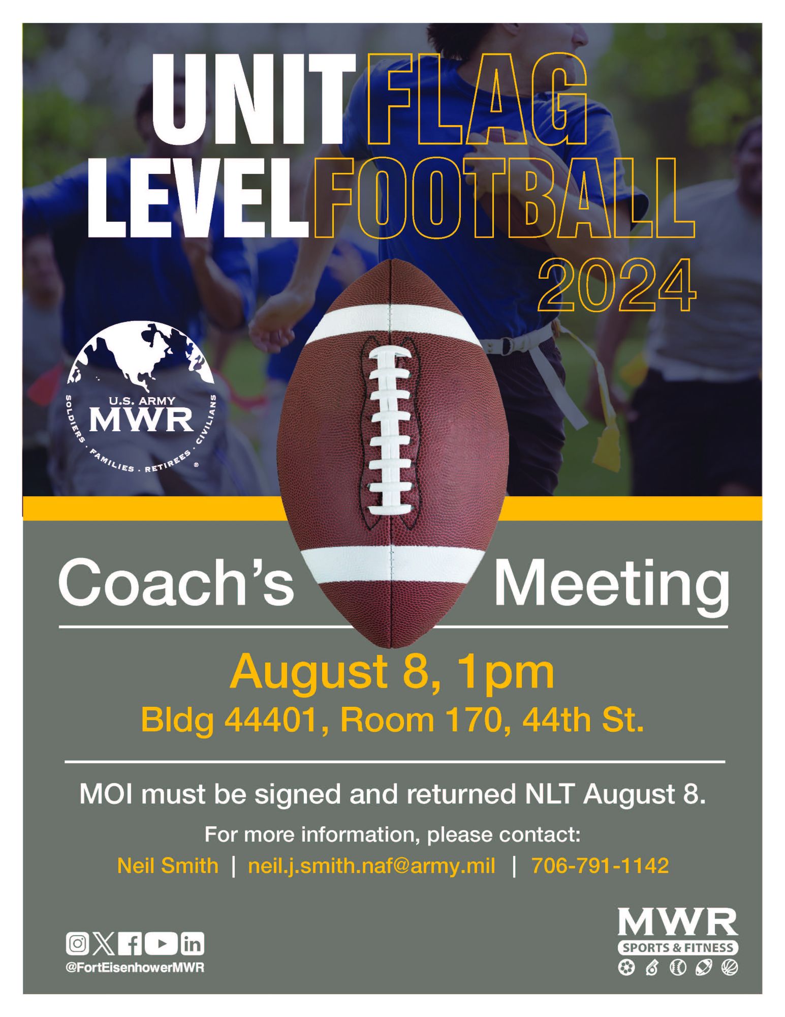 Units desiring to enter a team or teams must submit their Memorandum(s) of Intent not later than 8 August 2024 to the Sports Office (Bldg. 44401) and a coach must attend the Coaches Meeting.