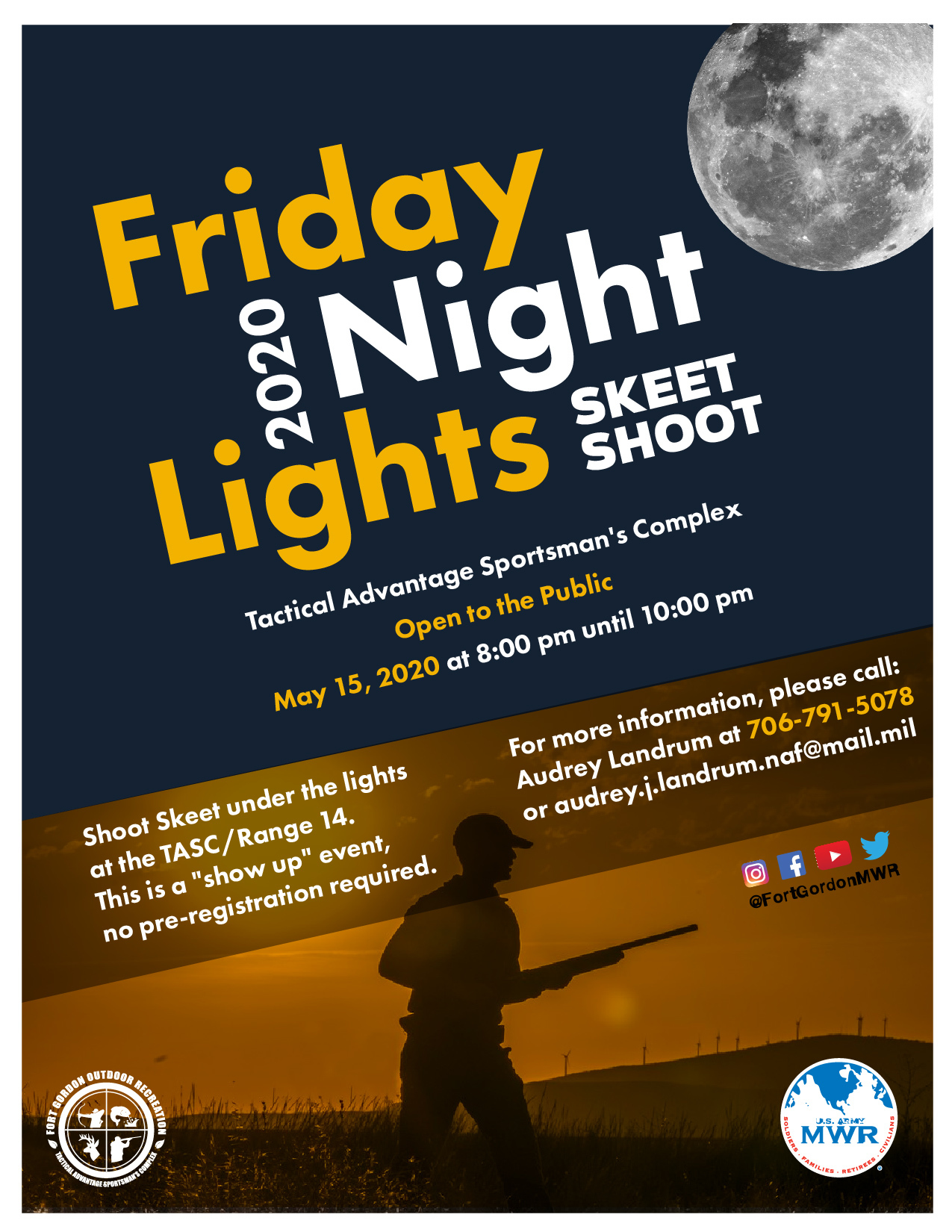 This is a fun event that requires no registration - show up ready to aim and fire! You must have an approved Fort Gordon Form 9423 before bringing your firearm on the installation. DO NOT attempt to bring your firearm on post without this form!