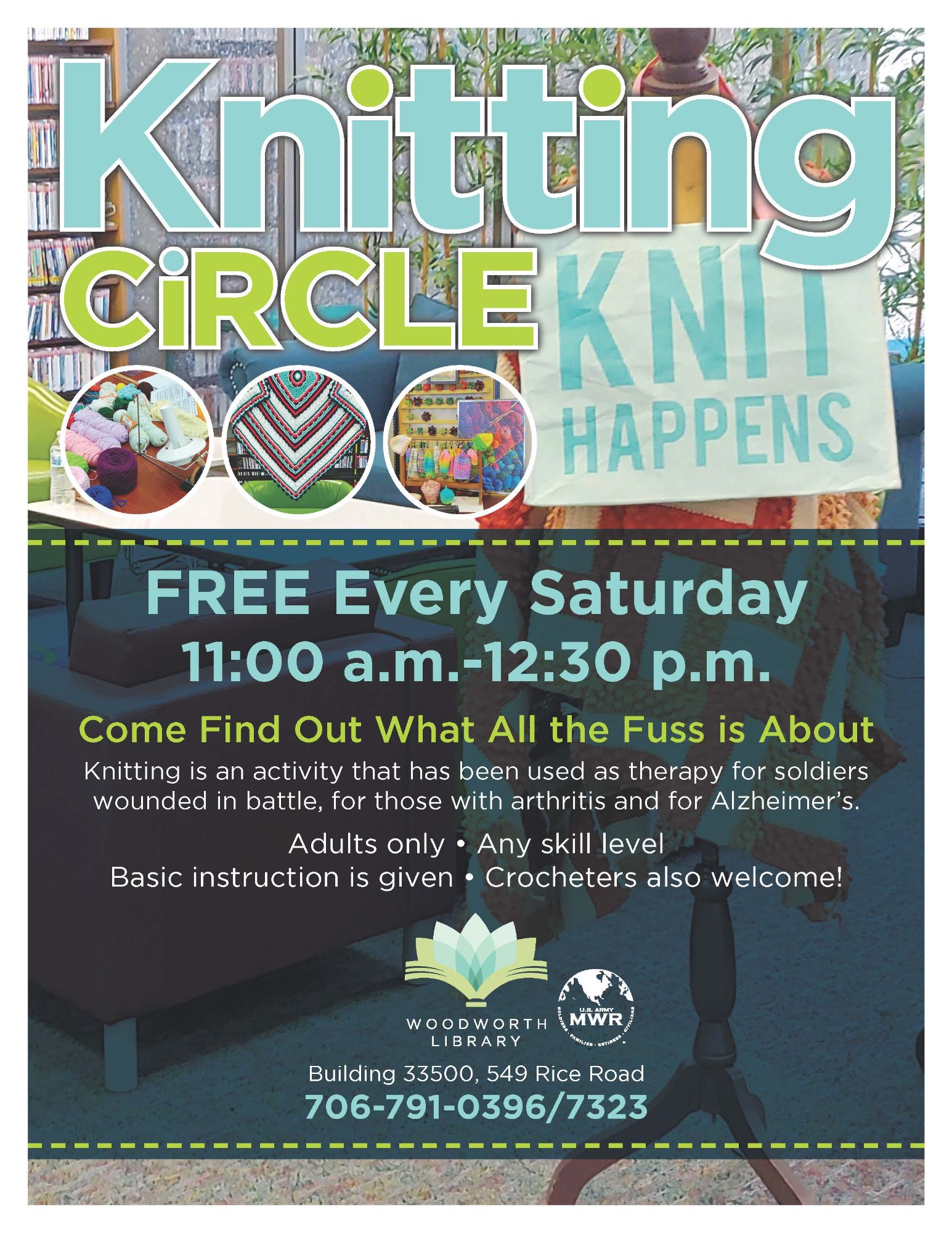 The Knitting Circle at Woodworth Library welcomes knitters of all levels. Basic instruction for beginners is given. The group includes every skill level, from brand new knitters to experienced ones. They also welcome those who love crochet. This group consists of 20-something service members to spouses to retirees – come make a friend of two!
