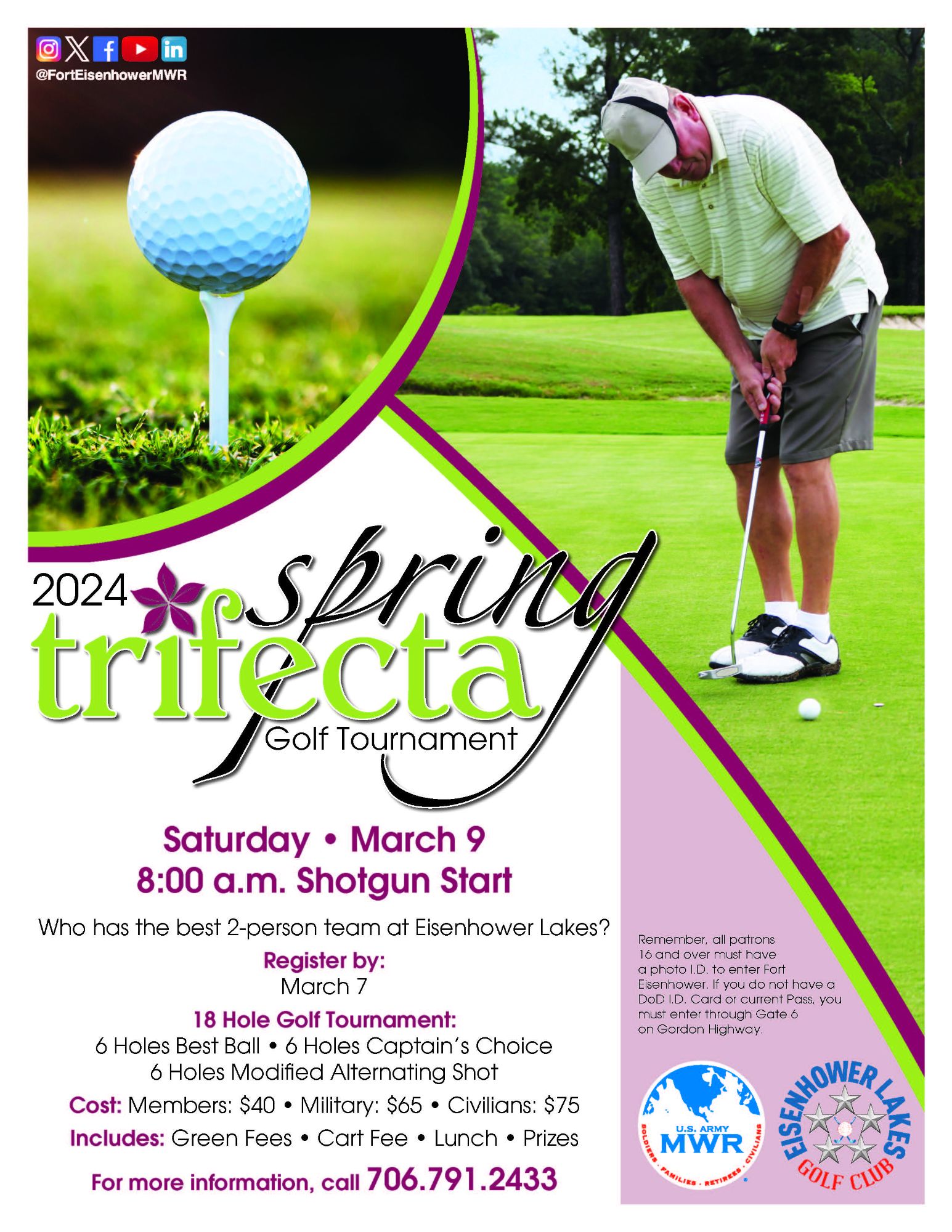 If golf is your game, be sure to register for the 2024 Spring Trifecta. This 18-hole tournament will consist of six holes of best ball, six holes of captain's choice, and six holes of modified alternating shot. The tournament will be flighted based on team total handicap.