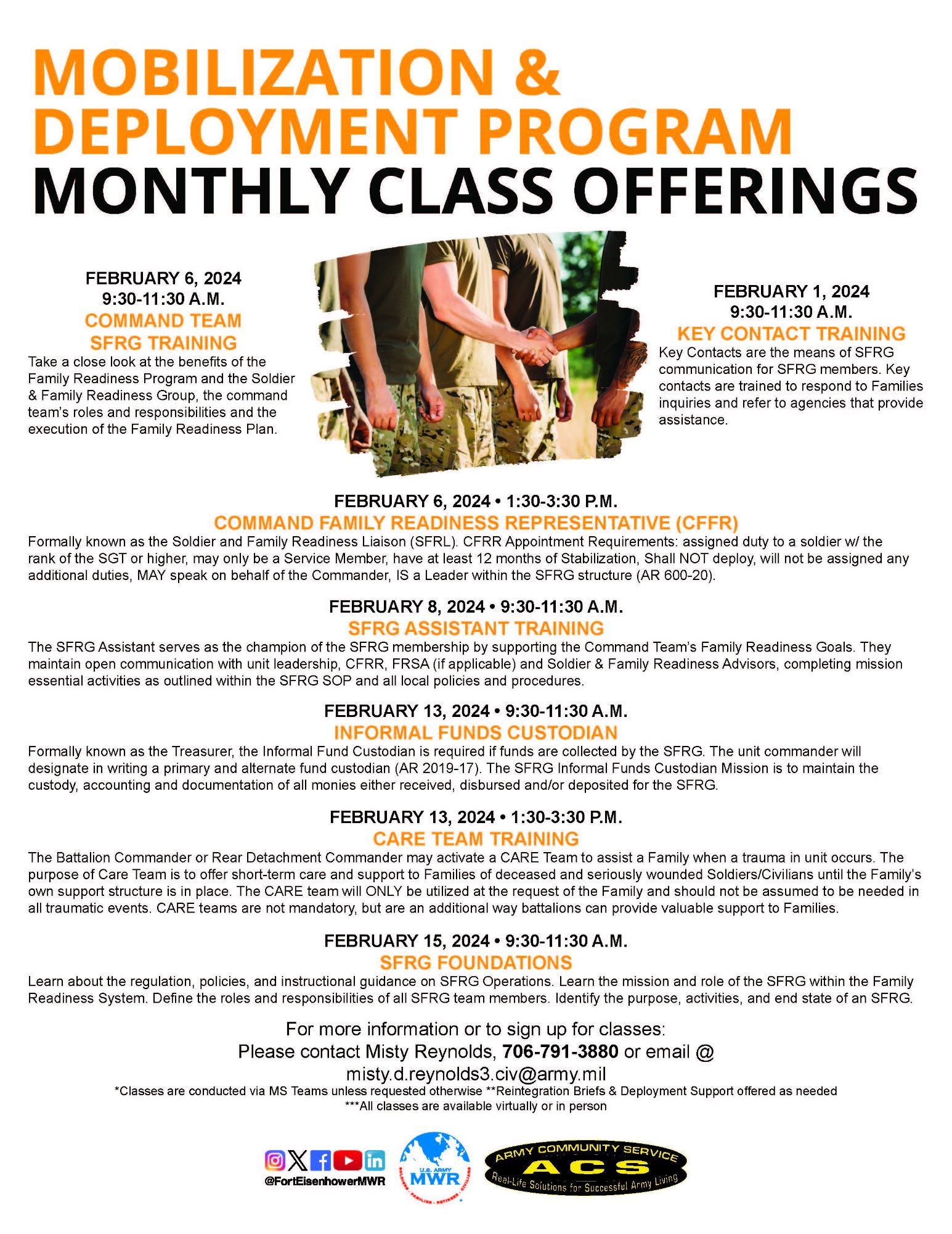 For more information or to sign up for classes, please contact Misty Reynolds at +1 (706)791-3880 or email at misty.d.reynolds3.civ@army.mil.