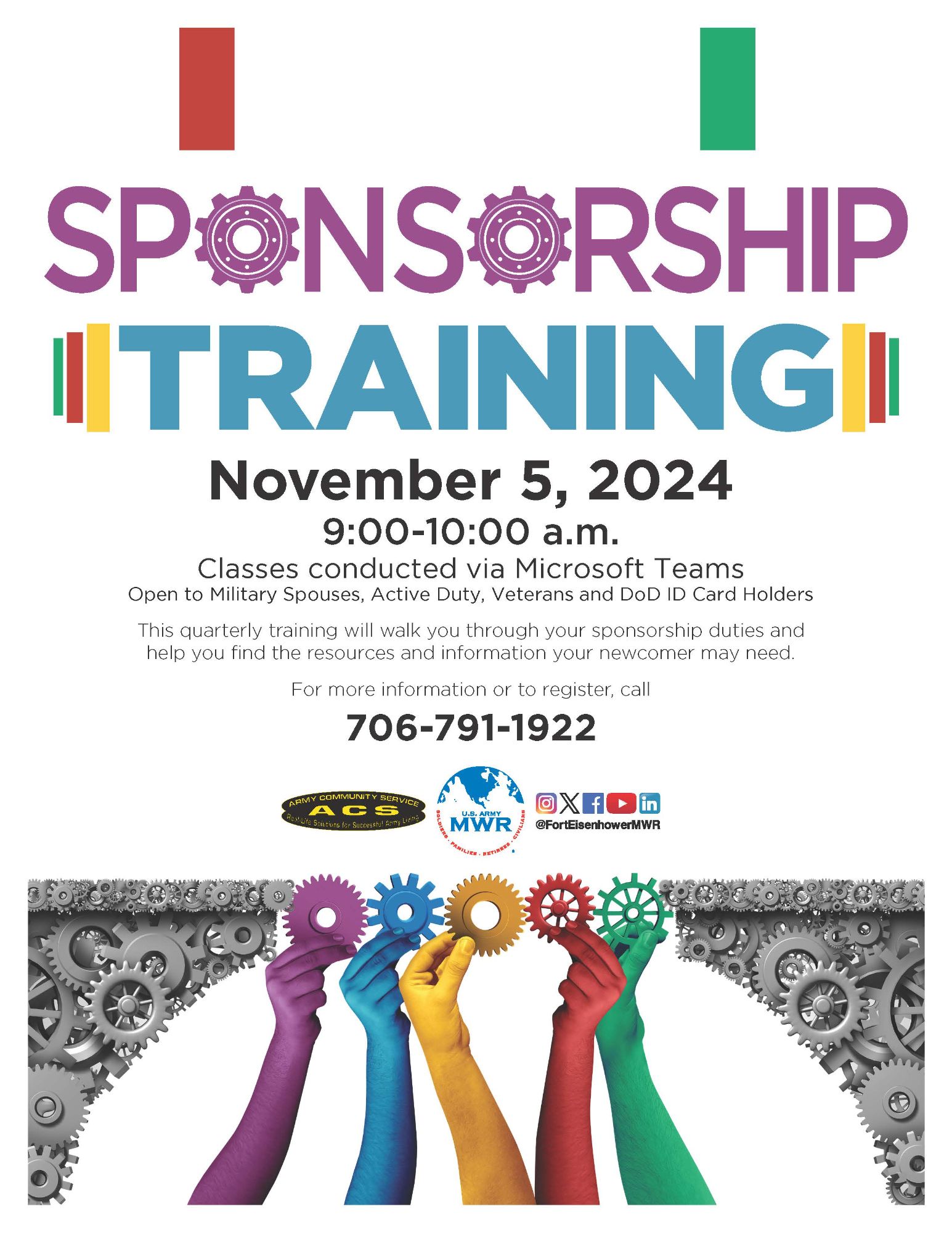 You are not alone! The task of moving your family from one installation to another can be challenging, but we have your back through the sponsorship program. Join us for sponsorship training which will walk you through your sponsorship duties and help you find the resources and information your newcomer may need.